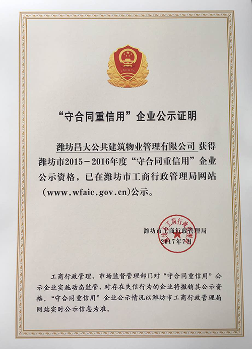 近日,濰坊市工商行政管理局公布了“濰坊市2015--2016年度“守合同重信用”企業(yè)公示名單。濰坊昌大公共建筑物業(yè)管理有限公司獲此殊榮。榮獲“守合同重信用”企業(yè)稱號,是我市政府部門及社會各界對“昌大公管公司”長期以來堅持誠信經(jīng)營、嚴守合同的充分肯定,也體現(xiàn)了“昌大公管公司”良好的企業(yè)信譽。 ......