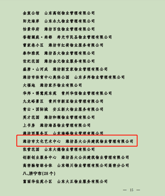 9月3日,山東省住房和城鄉(xiāng)建設廳公布關于品牌建設典型示范案例和“質量標桿”項目(第二批)名單,我公司作為品牌建設典型示范案例予以公布、服務管理的濰坊市文化藝術中心和峽山區(qū)創(chuàng)新創(chuàng)業(yè)服務中心同時獲得質量標桿項目。