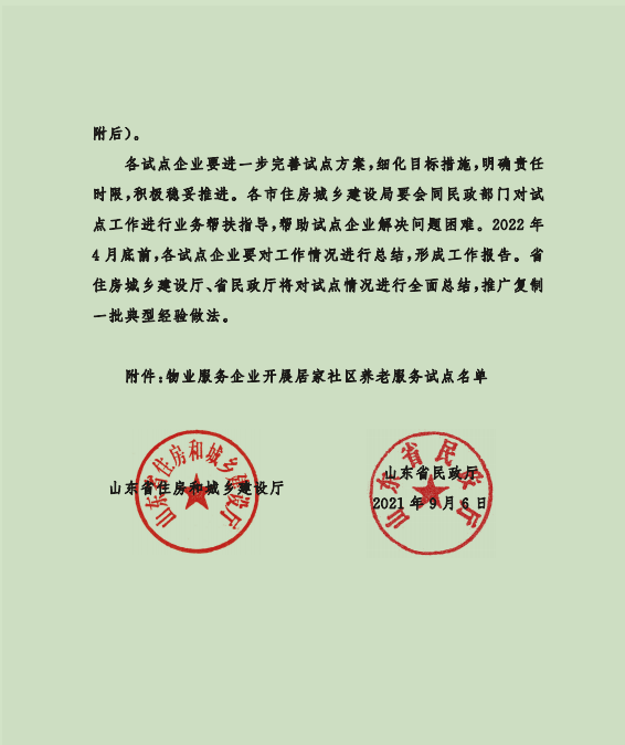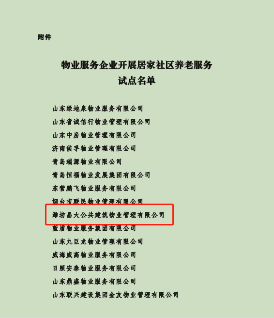 2021年9月6日,山東省住房和城鄉(xiāng)建設(shè)廳、山東省民政廳聯(lián)合公布了關(guān)于物業(yè)服務(wù)企業(yè)開(kāi)展居家社區(qū)養(yǎng)老服務(wù)試點(diǎn)名單,我公司在首批試點(diǎn)名單之列。